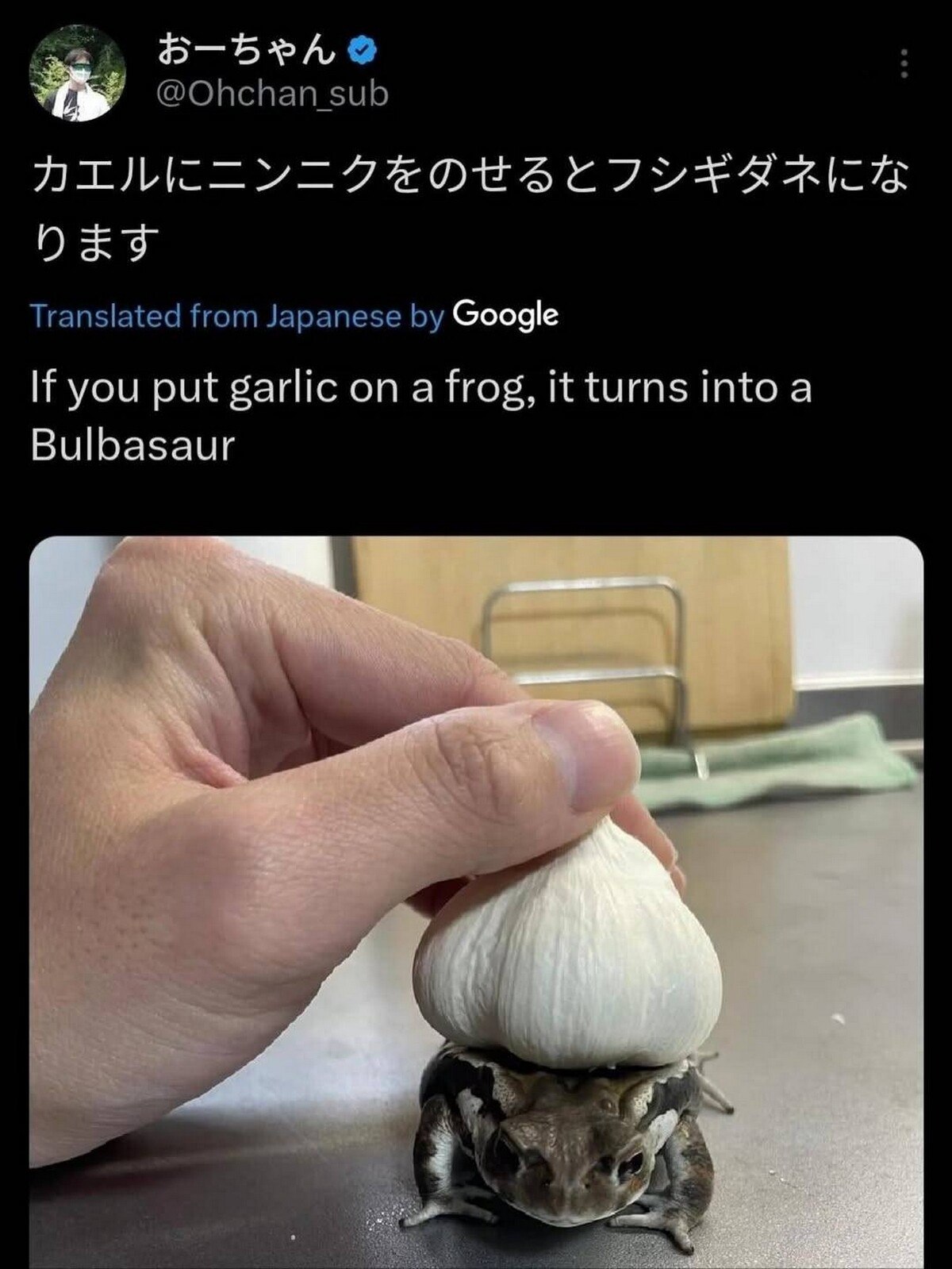 На изображении показана рука, которая держит головку чеснока, аккуратно помещенную на спину жабы. Жаба сидит на серой поверхности, возможно, на кухонном столе. Сверху над изображением виден скриншот поста из Твиттера, в котором на японском языке написано: "Если положить чеснок на лягушку, она превратится в Бульбазавра". Эта фраза объясняет юмор и смысл данного мема, отсылая к покемону Бульбазавру, который имеет на спине луковицу.