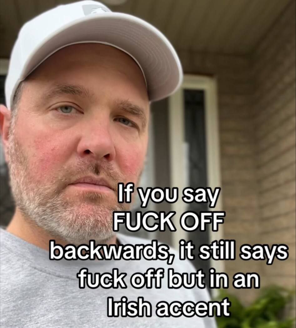 На изображении представлен мужчина средних лет в белой бейсболке и серой футболке. У него легкая небритость на лице, а кожа слегка покрасневшая. На заднем плане виден светлый дом и дверной проем. Надпись на изображении гласит: "If you say FUCK OFF backwards, it still says fuck off but in an Irish accent" (Если произнести "FUCK OFF" наоборот, это все равно будет "fuck off", но с ирландским акцентом).