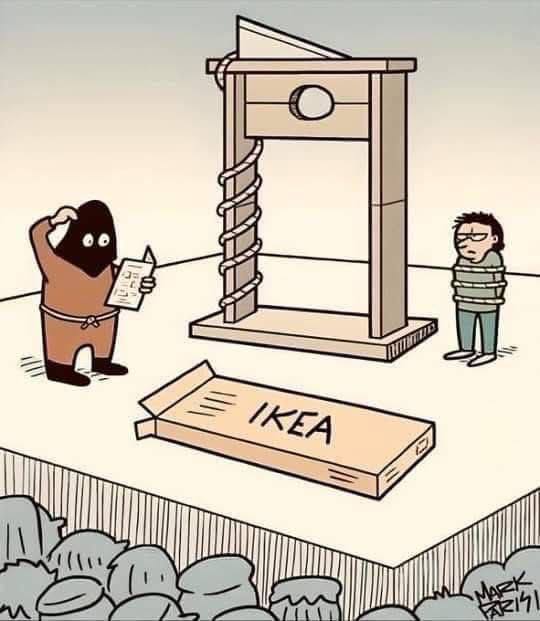 На этом меме изображена сцена казни на гильотине, но с юмористическим подтекстом. Палач в черном капюшоне стоит перед гильотиной, держа в руке инструкцию. Он чешет затылок, явно пытаясь разобраться в схеме сборки. Рядом с ним стоит связанный человек, который ждет своей участи. Перед гильотиной лежит картонная коробка с логотипом "IKEA", что намекает на сложности сборки мебели из этого магазина. Зрители наблюдают за происходящим снизу. Это карикатура на то, как порой трудно бывает следовать инструкциям по сборке, даже если речь идет о чем-то серьезном. Мем "IKEA гильотина" высмеивает известную сложность сборки продукции IKEA, сравнивая ее с такой экстремальной ситуацией, как гильотина. Палач, который должен просто выполнить свою работу, вынужден читать инструкцию, что делает ситуацию абсурдной. Связанный человек, ожидающий казни, лишь усиливает комический эффект, так как его жизнь зависит от того, сможет ли палач правильно собрать устройство. Таким образом, мем передает идею о том, что инструкции IKEA могут быть настолько запутанными, что даже опытный палач с ними не справится.