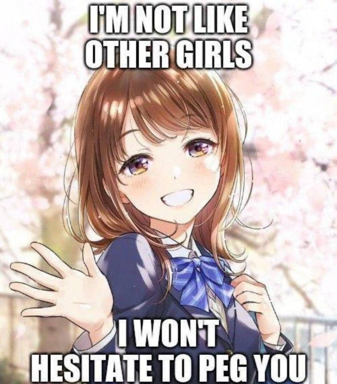 На изображении представлен аниме-персонаж, милая девушка с каштановыми волосами и фиолетовыми глазами, которая улыбается и протягивает руку. На ней школьная форма, включающая темно-синий пиджак и синий бант в полоску. Фон размыт, но видны розовые цветы, напоминающие цветение сакуры. Текст на изображении гласит: "I'm not like other girls, I won't hesitate to peg you" — "Я не такая, как другие девушки, я без колебаний отпегаю тебя".