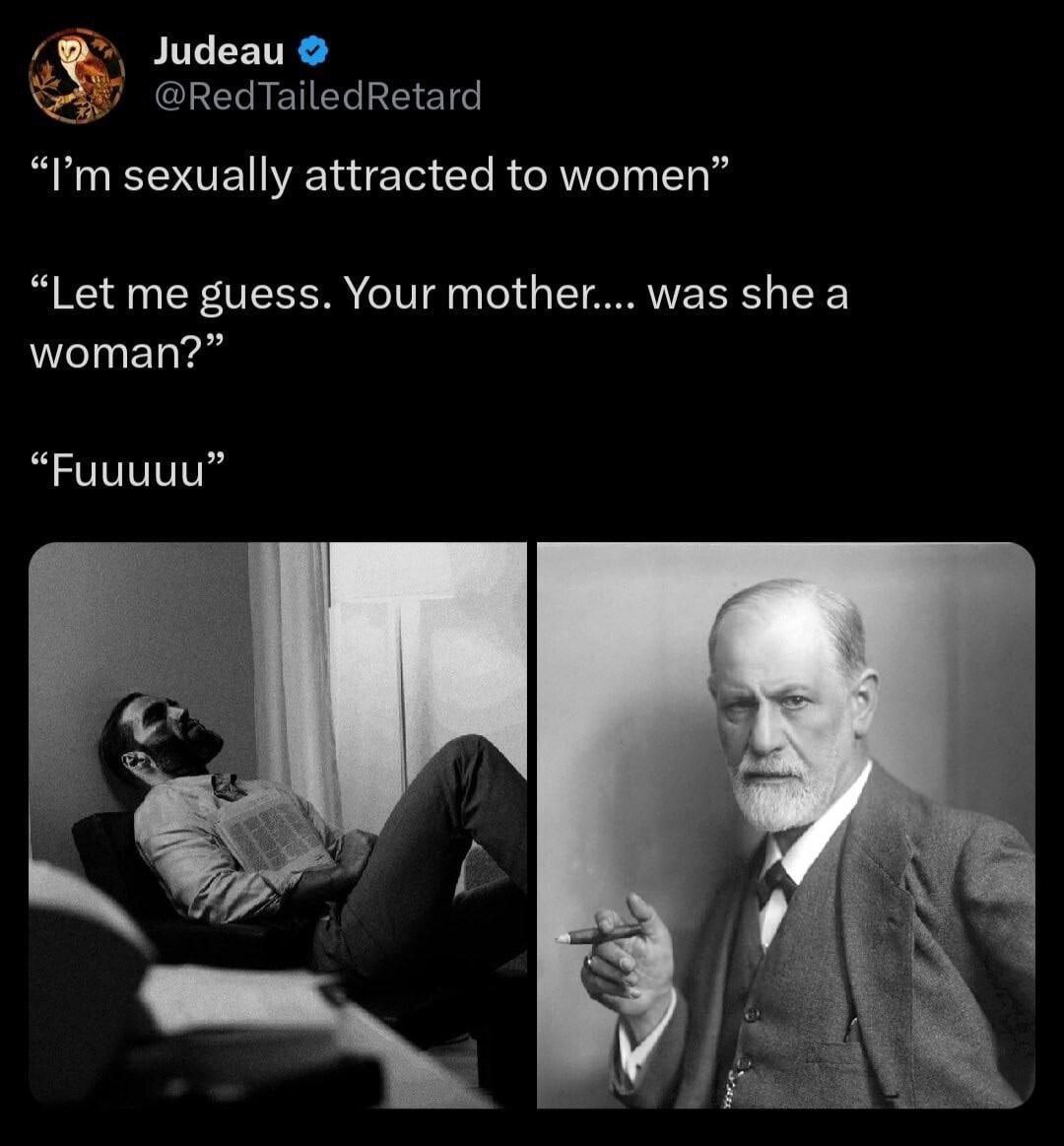 На картинке представлен скриншот твита, где мужчина говорит, что его сексуально привлекают женщины. В ответ Зигмунд Фрейд, изображенный на чёрно-белом фото справа с сигарой в руке, задаёт наводящий вопрос: "Позвольте угадать. Ваша мать была женщиной?". Это вызывает удивление или неловкость у пациента, который произносит затяжное "Фууууу". На другой чёрно-белой фотографии слева видно человека, лежащего в кресле и, вероятно, проходящего психотерапию. Пациент удивлён или огорчён таким глубоким вопросом, который, по теории Фрейда, объясняет его предпочтения. Мем "I’m sexually attracted to women" используется для высмеивания фрейдистской теории психоанализа, которая часто сводит человеческие комплексы и предпочтения к отношениям с родителями. Фрейд (Freud), известный австрийский психоаналитик, часто связывал поведение взрослых с детскими переживаниями и фигурой матери, что в меме доведено до абсурда.