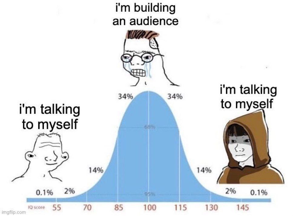 Мем основан на графике нормального распределения IQ, где по оси X отложены значения IQ, а по оси Y – процент людей. Слева, где IQ низкий, изображен персонаж Wojak с текстом «i'm talking to myself» (я разговариваю сам с собой). В центре, где IQ находится в среднем диапазоне, показан плачущий Wojak в очках с подписью «i'm building an audience» (я собираю аудиторию). Справа, где IQ высокий, снова изображен Wojak в капюшоне с текстом «i'm talking to myself» (я разговариваю сам с собой). Таким образом, мем высмеивает идею, что как люди с очень низким, так и с очень высоким IQ могут ощущать себя одинаково – они разговаривают сами с собой, в то время как люди со средним интеллектом пытаются привлечь к себе внимание.