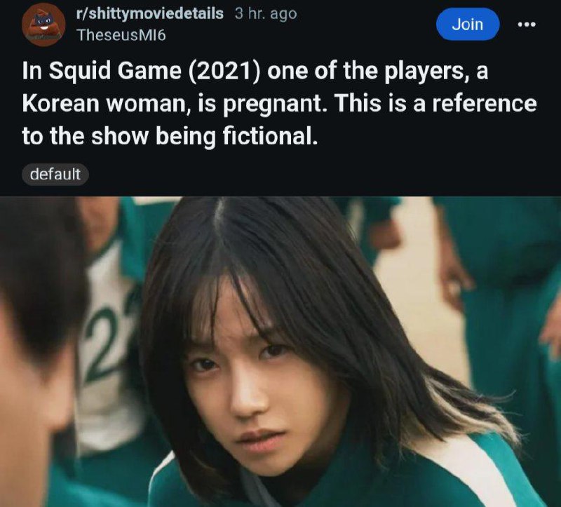 На изображении представлен скриншот из сериала «Игра в кальмара» с молодой корейской женщиной, участницей игры, которая смотрит немного вверх, налево, с обеспокоенным выражением лица. У нее темные волосы, часть которых светлее на концах, и она одета в зеленую спортивную форму. На заднем плане также видны другие участники в такой же форме. Над изображением расположен текст с Reddit, который гласит: «В "Игре в кальмара" (2021) одна из игроков, корейская женщина, беременна. Это отсылка к тому, что шоу вымышленное». Этот текст является сатирическим комментарием к так называемым «глубоким» деталям фильмов, которые на самом деле очевидны или нелепы. Шутка заключается в том, что беременность персонажа никак не связана с вымышленностью сериала, так как беременные женщины существуют в реальной жизни.