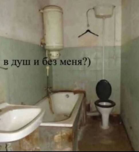 На изображении показана ванная комната в запущенном состоянии. Стены обшарпаны, плитка грязная и местами отсутствует. На переднем плане раковина, рядом с ней ванна, а в углу унитаз. Над ванной висит водонагреватель. Также на стене висит вешалка. Надписи на мем гласит: "в душ и без меня?". Это фраза, которая иронично задает вопрос о том, что происходит в этой ванной комнате, намекая на ее непригодное состояние для принятия душа. Кажется, что это ванная комната в старой хрущевке или какой-нибудь коммуналке.