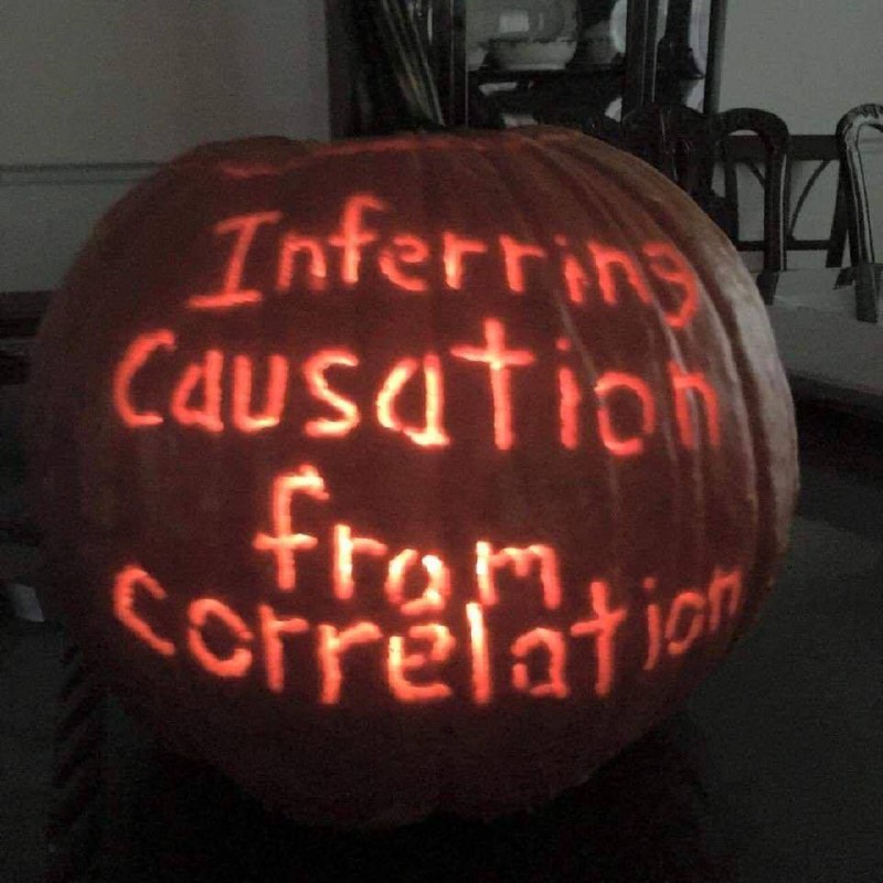 На изображении показана тыква, вырезанная к Хэллоуину, которая светится изнутри. На тыкве вырезана фраза на английском языке «Inferring Causation from Correlation», что переводится как «Вывод причинно-следственной связи из корреляции». Это известная статистическая поговорка, предостерегающая от поспешных выводов о причинности, когда на самом деле есть только корреляция. Тыква установлена в темной комнате, и свет, исходящий из нее, является единственным источником освещения. На заднем плане можно различить очертания мебели, что создает домашнюю атмосферу.