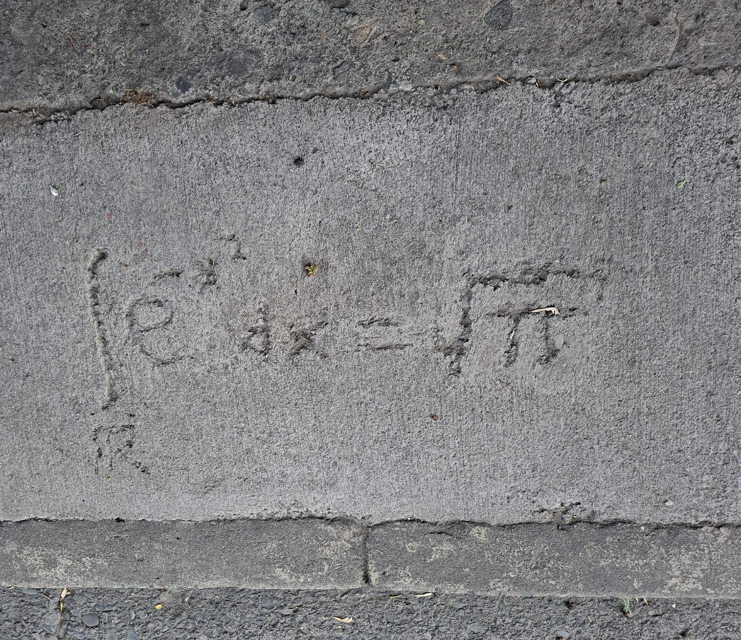 На изображении показан бетонный тротуар, на котором кто-то написал математическую формулу: интеграл от e в степени -x квадрат dx от минус бесконечности до плюс бесконечности равен корню из пи. Формула выцарапана на слегка влажном или свежем бетоне, что придает ей текстурный вид. Слева и справа от формулы виден неровный край, отделяющий тротуар от более темного и зернистого асфальта или другой дорожной поверхности.