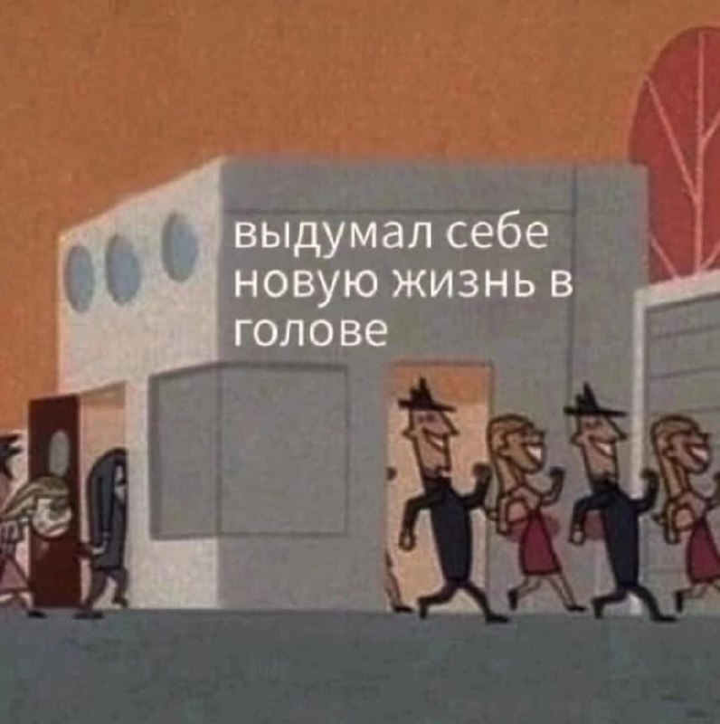 На изображении показаны персонажи из мультсериала "Суперкрошки", где девочка с грустным видом стоит одна, в то время как другие персонажи, улыбаясь, проходят мимо. Слева видны двое персонажей, из которых один похож на Девочку-пузырёк с распущенными волосами, которая выглядит немного грустной или расстроенной, а позади неё, скрываясь в тени, стоит другой, нечётко видимый персонаж. Справа, за углом здания, появляются радостные персонажи, напоминающие банду Амиго: двое мужчин в шляпах и двое женщин в платьях, которые весело шагают. Над всей сценой крупным шрифтом видна надпись: "выдумал себе новую жизнь в голове", что означает "придумал себе новую жизнь в голове". Это мем о том, как человек погружается в свои мечты и фантазии, представляя себе идеальную жизнь, в то время как реальность (персонажи слева) остаётся менее радостной или интересной.