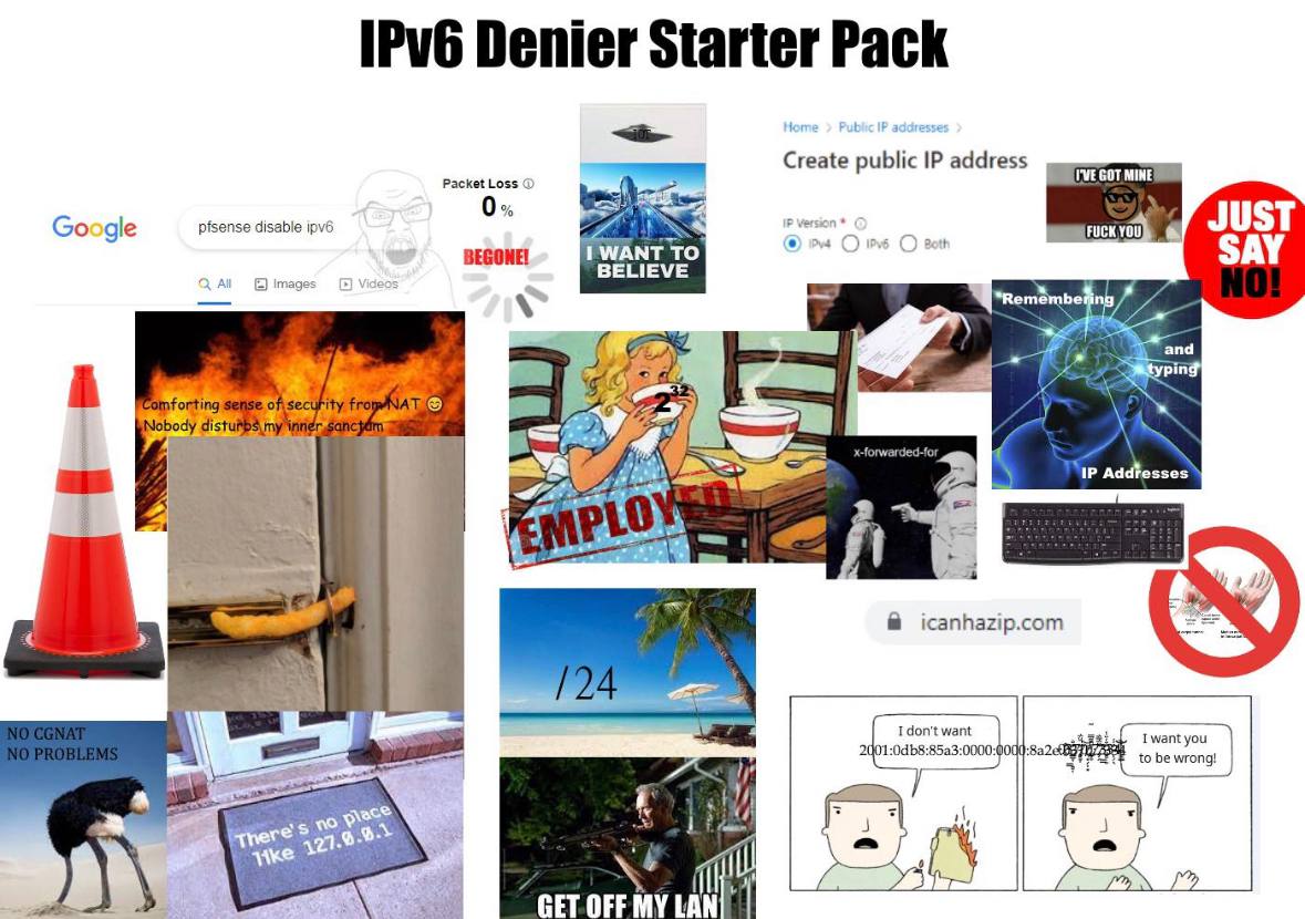 Мем "Набор начинающего отрицателя IPv6" представляет собой коллаж из множества различных изображений, каждое из которых сатирически иллюстрирует типичные аргументы и поведение людей, отказывающихся использовать IPv6. Среди элементов коллажа можно увидеть скриншоты поисковых запросов вроде "pf sense disable ipv6", изображения, символизирующие ложное чувство безопасности от NAT ("comforting sense of security from NAT"), фразы типа "I want to believe" (Я хочу верить), а также различные отсылки к старым протоколам и нежеланию переходить на новые технологии. Мем высмеивает тех, кто упорно цепляется за устаревшие методы, несмотря на их неэффективность или проблемы, которые они могут создавать. В описании также упоминаются фразы "Just say no!" (Просто скажи нет!), "I've got mine" (У меня есть свое) и "Fuck you", которые отражают нежелание делиться или принимать новое. Кроме того, присутствуют изображения, высмеивающие сложности с запоминанием и набором IPv6 адресов. В целом, мем создает юмористический портрет человека, который активно сопротивляется прогрессу в области сетевых технологий.