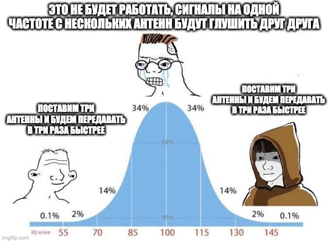 На изображении представлен мем, демонстрирующий кривую нормального распределения IQ, где разные уровни интеллекта соответствуют разным подходам к решению одной и той же задачи. Слева, на "умном" конце спектра IQ, изображен персонаж Wojak с характерной деформированной головой, который предлагает: "Поставим три антенны и будем передавать в три раза быстрее". В центре, на вершине кривой, где находится большинство людей со средним IQ, изображен плачущий Wojak в очках, который возражает: "Это не будет работать, сигналы на одной частоте с нескольких антенн будут глушить друг друга". Справа, на "гениальном" конце спектра IQ, снова изображен Wojak в капюшоне, который повторяет ту же фразу, что и "глупый" персонаж: "Поставим три антенны и будем передавать в три раза быстрее". Этот мем иронизирует над тем, что иногда крайне простые или даже "глупые" идеи могут оказаться неожиданно эффективными или же гениальные умы приходят к тем же выводам, что и "глупцы", но с совершенно иными обоснованиями. Он иллюстрирует концепцию "большого ума", который может достигать тех же выводов, что и "малый ум", обходя при этом промежуточную логику "среднего ума".