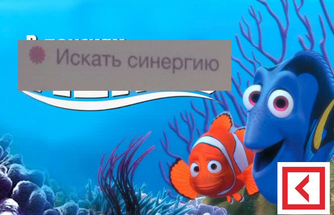 На изображении представлен кадр из мультфильма «В поисках Немо» с персонажами Дори и Марлином на фоне подводного мира с кораллами. В верхней части картинки наложен прямоугольник светло-серого цвета, на котором видна надпись: «Искать синергию». В правом нижнем углу расположен красный квадрат с белым символом, похожим на угловую скобку, указывающую влево. Мем обыгрывает часто используемую, но порой бессмысленную фразу «искать синергию» в деловой среде, сравнивая её с наивностью и позитивным настроем персонажей мультфильма.