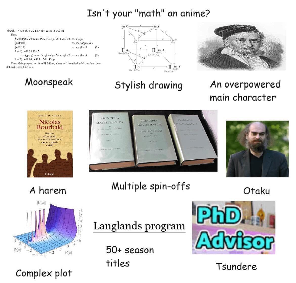 Isn't your "math" an anime? Moonspak. Stylish drawing. An overpowered main character. Nicolas Bourbaki. A harem. Principia mathematica. Multiple spin-offs. Otaku. Complex plot. Langlands program. 50+ season titles. PhD Advisor. Tsundere.