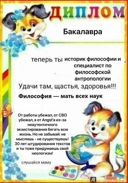 Диплом. Бакалавра. Теперь ты историк философии и специалист по философской антропологии. Удачи там, счастья, здоровья!!! Философия — мать всех наук. От работы убежал, от СВО убежал, а от Angst'а из-за неаутентичного экзистирования бегать всю жизнь. Но не забывай: не мыслишь — не существуешь! 30 лет штудирования текстов и ты тоже придумаешь свой неологизм! Слушайся маму.