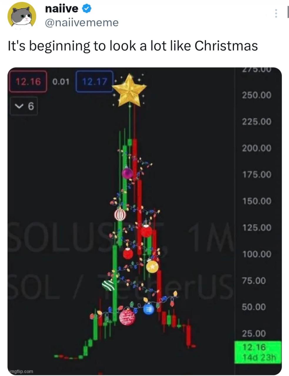 На изображении показан скриншот из Твиттера пользователя с ником @naiivememe и аватаркой в виде кота. В твите написано: "It's beginning to look a lot like Christmas" (Начинает очень походить на Рождество). Ниже расположен график изменения цены актива, стилизованный под рождественскую елку. Зеленые и красные свечи графика образуют форму ели, украшенной разноцветными гирляндами и елочными шарами. На верхушке графика-елки сияет золотая звезда. Справа на графике указаны ценовые отметки, а в левом верхнем углу видны даты 12.16 и 12.17. В правом нижнем углу графика есть зеленая область с надписью "12.16 14d 23h". Фоном для графика служат полупрозрачные надписи "SOLUSDT" и "SOL / TetherUS".