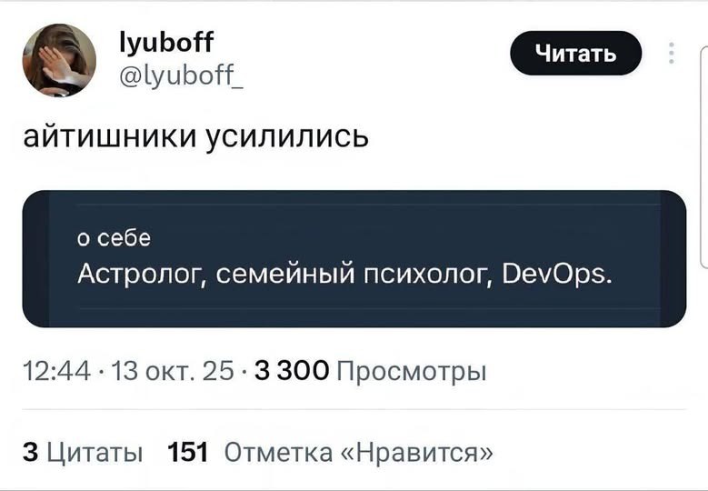 Мем представляет собой скриншот из социальной сети Twitter (ныне X), на котором виден пост пользователя с ником lyuboff. Профиль lyuboff_ имеет фотографию девушки, закрывающей лицо рукой. Основной текст поста гласит: "айтишники усилились". Ниже расположен блок "О себе", в котором перечислено: "Астролог, семейный психолог, DevOps.". Этот мем иронизирует над разносторонними и, на первый взгляд, несочетаемыми навыками, которые некоторые люди могут указывать в своих профилях, а также над тем, как "усиливаются" айтишники, добавляя к своим техническим компетенциям гуманитарные или даже эзотерические. Пользователи "Твиттера" активно обсуждают, как люди осваивают необычные для IT-сферы профессии, при этом оставаясь "айтишниками".