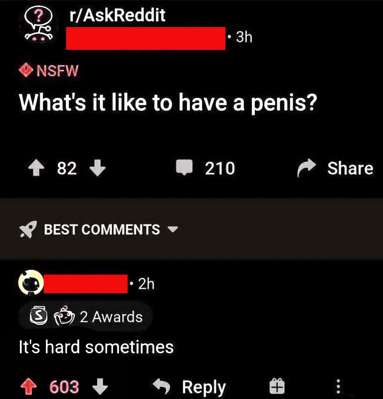 r/AskReddit. NSFW. What's it like to have a penis? BEST COMMENTS. It's hard sometimes.