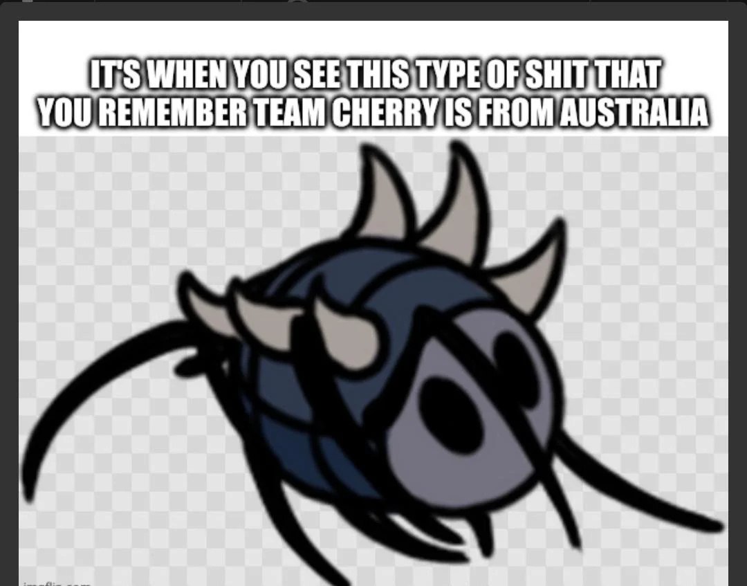 На изображении показан персонаж из игры Hollow Knight, похожий на большого бронированного жука, парящего в воздухе на прозрачном фоне. У него тёмно-синее тело с серыми шипами и рогами, а также длинные чёрные усики. Над жуком крупными белыми буквами на чёрном фоне написано: "IT'S WHEN YOU SEE THIS TYPE OF SHIT THAT YOU REMEMBER TEAM CHERRY IS FROM AUSTRALIA", что переводится как: "Именно когда ты видишь такое дерьмо, ты вспоминаешь, что Team Cherry из Австралии". Это отсылка к необычным и часто пугающим животным Австралии, и персонаж жука здесь представлен как нечто подобное. Мем иронично связывает внешний вид существа из игры с фауной Австралии, намекая на её экзотичность и иногда жутковатость.