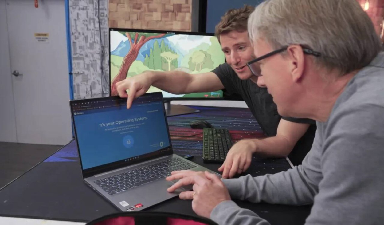 На изображении двое мужчин смотрят в экран ноутбука. Один из них, с русыми волосами и в черной футболке, указывает пальцем на экран, где видна надпись «It's your Operating System» (Это ваша операционная система). Второй мужчина, седовласый и в очках, сидит перед ноутбуком и держит руки на клавиатуре и тачпаде, внимательно смотря на экран. На заднем плане виден большой монитор с изображением природы.