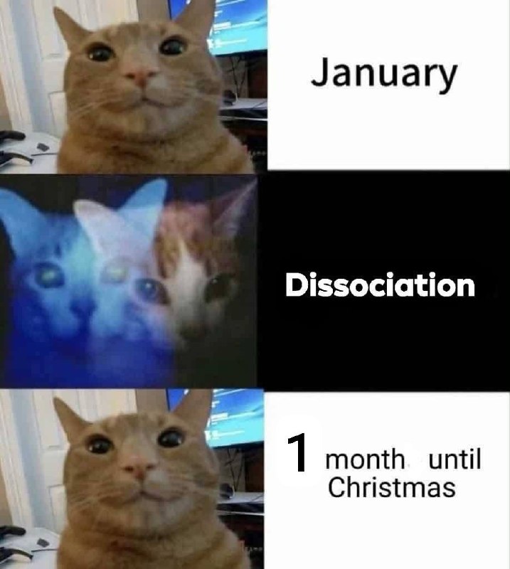 На изображении представлен мем из трех панелей, показывающий различные реакции рыжего кота на временные отрезки. На верхней панели кот выглядит немного озадаченным или задумчивым, рядом с надписью "January" (Январь). На средней панели кот показан с эффектом диссоциации или множественности, его изображение как будто расплывается, и надпись рядом гласит "Dissociation" (Диссоциация). Нижняя панель снова показывает того же кота с озадаченным выражением морды, а рядом надпись "1 month until Christmas" (1 месяц до Рождества), что создает комический эффект быстротечности времени и того, как оно влияет на восприятие кота. Мем, вероятно, отражает ощущение того, как быстро пролетает время от начала года до предрождественской суеты, и состояние диссоциации, когда дни сливаются воедино, не давая человеку опомниться.