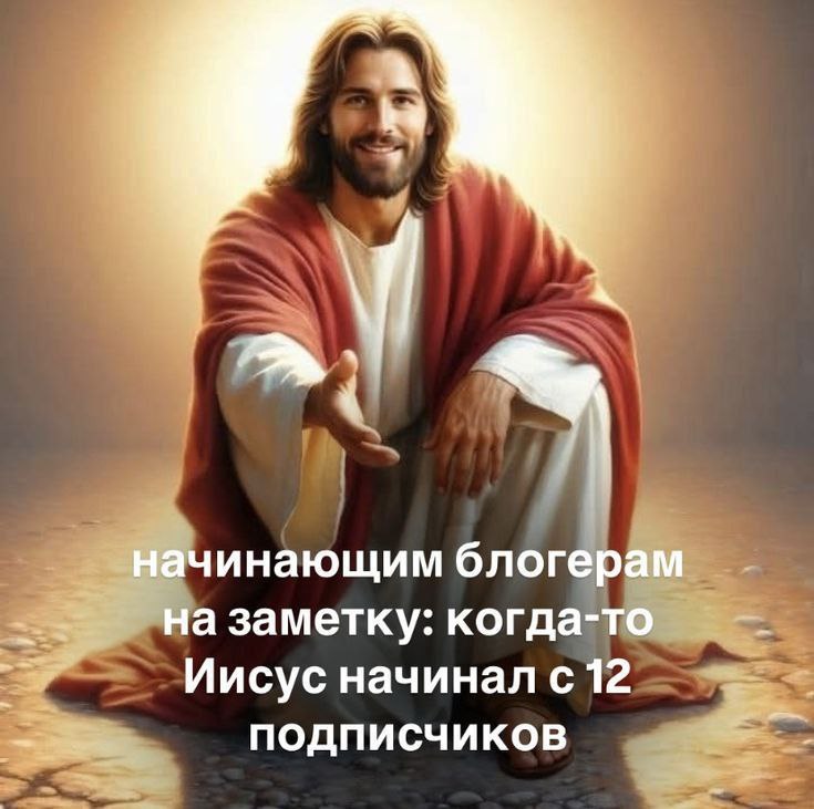 На изображении представлен Иисус Христос, улыбающийся и протягивающий правую руку вперед, как будто приглашая или приветствуя кого-то. Он одет в традиционные белые одежды и красный плащ. На фоне виден мягкий золотистый свет, создающий атмосферу тепла и благословения. Ниже на изображении наложен текст, который является основной частью мема. Текст на меме гласит: «Начинающим блогерам на заметку: когда-то Иисус начинал с 12 подписчиков». Эта фраза является шуточным сравнением пути Иисуса Христа и его апостолов с началом карьеры современных блогеров, подчёркивая, что даже великие личности начинали с малого и постепенно собирали свою аудиторию.