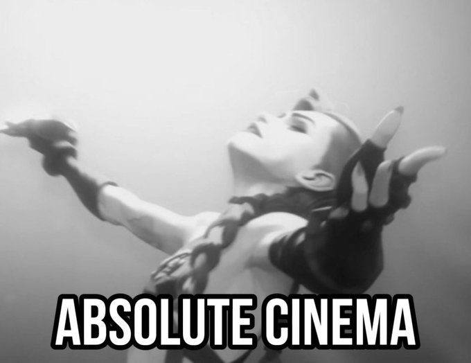 На чёрно-белом изображении представлена Джинкс из мультсериала «Аркейн», смотрящая вверх с распростёртыми руками, одна из которых указывает вдаль, а другая согнута в локте и её ладонь раскрыта вперёд. Она словно наслаждается моментом или выражает торжество. Под ней крупным белым шрифтом с чёрной обводкой написано «Absolute cinema», что переводится как «Настоящее кино» или «Абсолютное кино». Мем используется для описания моментов в фильмах, играх или реальной жизни, которые настолько эпичны, драматичны или кинематографичны, что вызывают сильные эмоции и ощущения, как будто это фрагмент высококачественного художественного произведения.