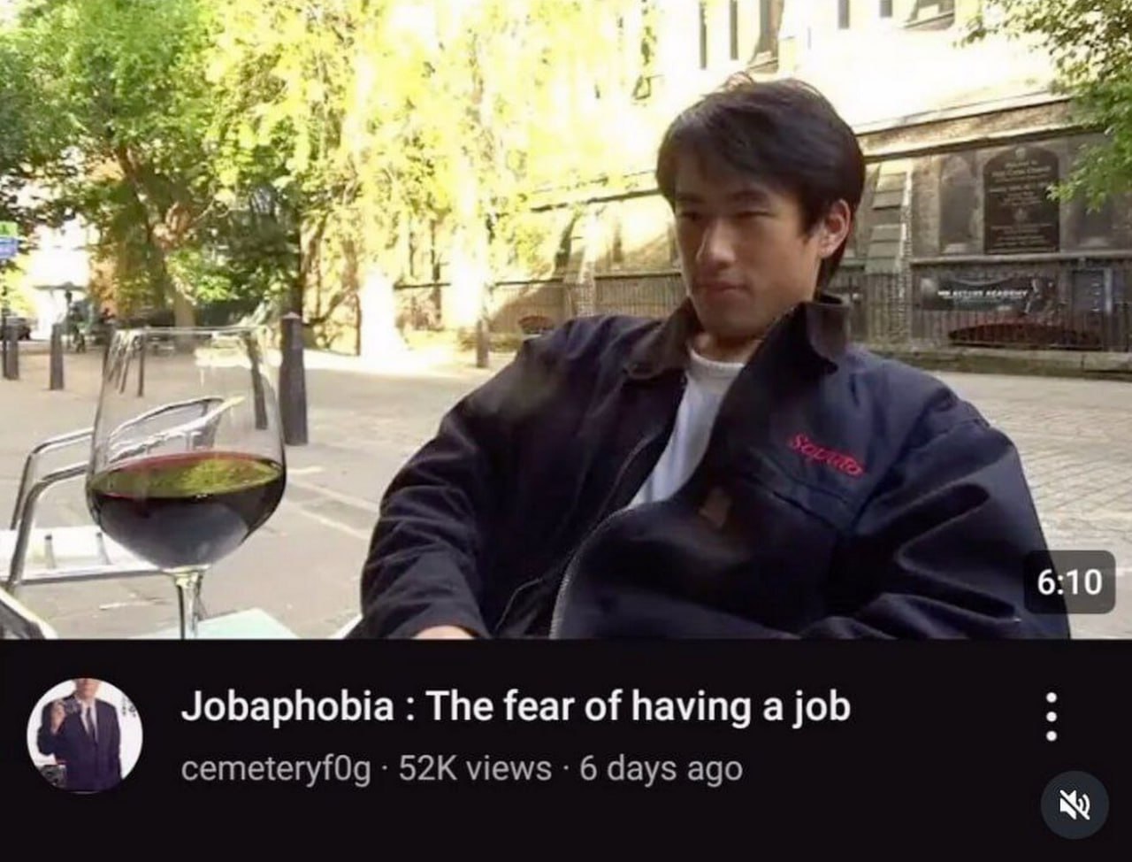 На изображении показан скриншот видео с YouTube. В центре изображения азиатский мужчина в темной куртке, сидящий за столиком на улице. Рядом с ним стоит бокал с красным вином. Мужчина выглядит задумчивым или немного грустным. На фоне видны деревья и старое каменное здание. Внизу скриншота видна часть заголовка видео: «Jobaphobia: The fear of having a job», что переводится как «Джобафобия: страх иметь работу» или «боязнь работы». Под заголовком указан автор канала «cemeteryf0g» и количество просмотров – «52K views 6 days ago» (52 тысячи просмотров 6 дней назад).