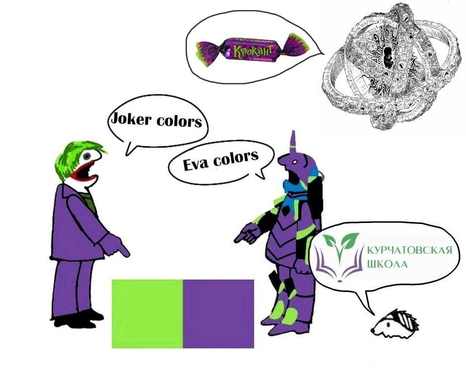 На изображении представлено сравнение цветов, где два персонажа указывают на зелено-фиолетовую палитру. Слева стоит персонаж, напоминающий Джокера, с зелеными волосами и в фиолетовом костюме, говорящий «Joker colors» (цвета Джокера). Справа стоит персонаж, похожий на Евангелиона, также выполненный в фиолетово-зеленых тонах, который говорит «Eva colors» (цвета Евы). Над ними в облачках речи показаны различные предметы, ассоциирующиеся с этой цветовой гаммой: конфета «Крокант», сложный геометрический объект, напоминающий библейский трон (офим), и логотип «Курчатовская школа» с маленьким ежиком, который как будто его произносит. Мем иллюстрирует, как одни и те же цвета могут вызывать разные ассоциации у разных людей или в разных контекстах.