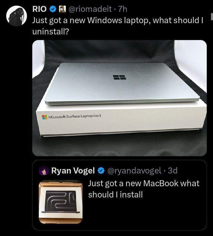 На изображении показаны два твита, контрастирующие подход пользователей к новым операционным системам. В первом твите пользователь RIO задает вопрос: «Just got a new Windows laptop, what should I uninstall?» (Только что купил новый ноутбук с Windows, что мне следует удалить?), демонстрируя Microsoft Surface Laptop Go 3 на его коробке. Во втором твите пользователь Ryan Vogel иронично спрашивает: «Just got a new MacBook what should I install» (Только что купил новый MacBook, что мне следует установить), показывая пустую коробку из-под MacBook. Этот мем подчеркивает стереотип о том, что Windows поставляется с множеством предустановленных программ, тогда как macOS считается более минималистичной и требует установки большинства приложений самостоятельно.