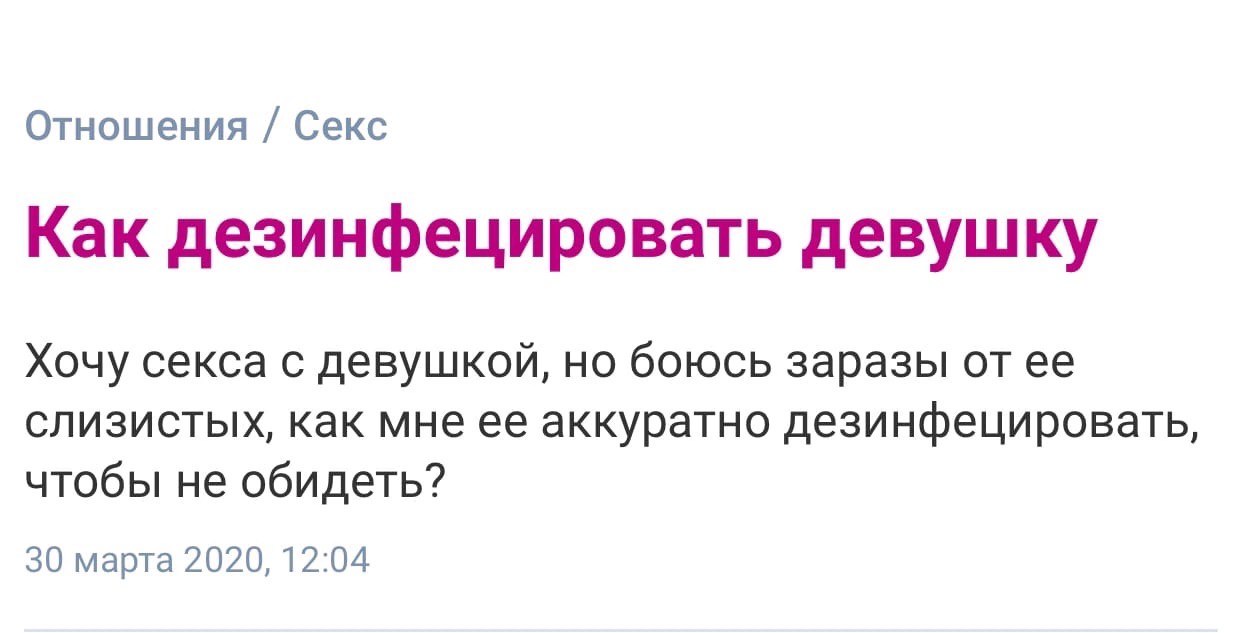 На изображении представлен скриншот с названием и текстом статьи, опубликованной на сайте 30 марта 2020 года. Заголовок статьи — «Как дезинфецировать девушку», а её основной текст гласит: «Хочу секса с девушкой, но боюсь заразы от ее слизистых, как мне ее аккуратно дезинфецировать, чтобы не обидеть?» (в переводе на русский: "Хочу секса с девушкой, но боюсь заразы от ее слизистых, как мне ее аккуратно дезинфицировать, чтобы не обидеть?"). Это юмористическое изображение, которое высмеивает нелепые вопросы, связанные с гигиеной и отношениями.