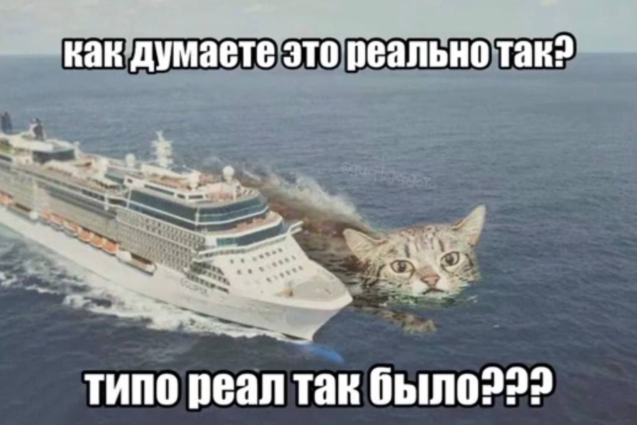 На изображении показан огромный кот, плывущий по океану прямо за круизным лайнером. Кот выглядит весьма реалистично, а лайнер оставляет за собой белый след на воде. Сверху надпись "Как думаете это реально так?", а снизу "Типо реал так было???" На данном меме, огромный кот, преследующий корабль, создает забавный и сюрреалистичный образ, вызывая у зрителя вопрос о его подлинности.