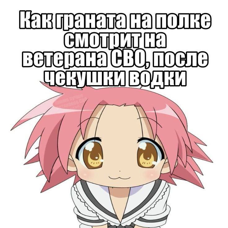 Мем изображает милого аниме-персонажа с розовыми волосами и большими карими глазами, который кокетливо и в то же время хитро смотрит на зрителя. Персонаж одет в матросский воротничок и белую рубашку с черными полосками. Надпись на меме гласит: "Как граната на полке смотрит на ветерана СВО, после чекушки водки". Это юмористическое сравнение, намекающее на непредсказуемое или опасное поведение, которое может возникнуть после употребления алкоголя, особенно у людей с боевым опытом. То есть, как граната на полке смотрит на ветерана СВО, после небольшой порции водки, так и этот аниме-персонаж смотрит на что-то с таким же выражением, как будто вот-вот произойдет что-то непредвиденное или взрывное.