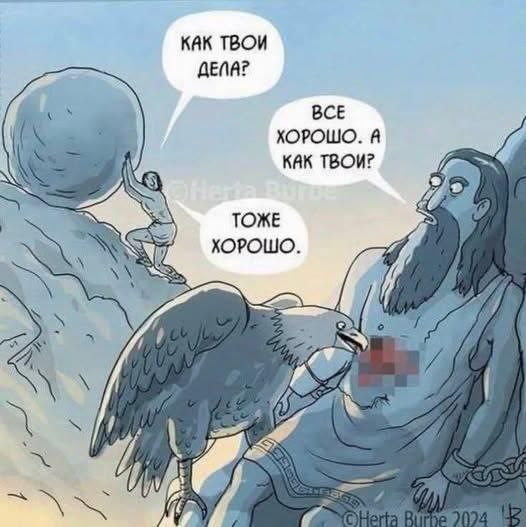 На изображении представлен комикс, в котором три известных персонажа из греческой мифологии, страдающие от вечных наказаний, вежливо интересуются делами друг у друга и отвечают, что у них все хорошо. Слева Сизиф катит огромный камень в гору, справа прикованный Прометей, которому орел выклевывает печень. Сизиф спрашивает: «Как твои дела?», на что Прометей отвечает: «Все хорошо. А как твои?», а Сизиф, в свою очередь, говорит: «Тоже хорошо». Этот мем иронизирует над шаблонными ответами на вопрос «как дела?», показывая, что даже в самых ужасных обстоятельствах люди склонны отвечать, что у них все в порядке, игнорируя реальное положение дел.