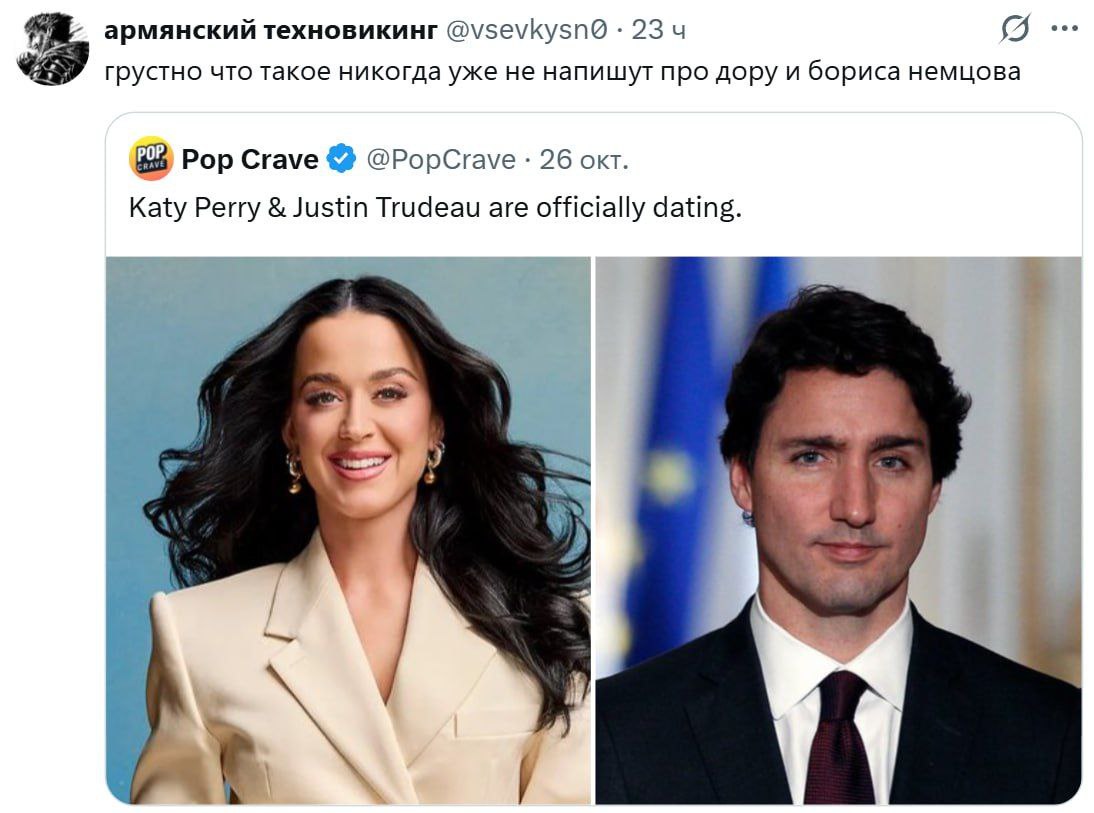 Грустно что такое никогда уже не напишут про дору и бориса немцова. Katy Perry & Justin Trudeau are officially dating.