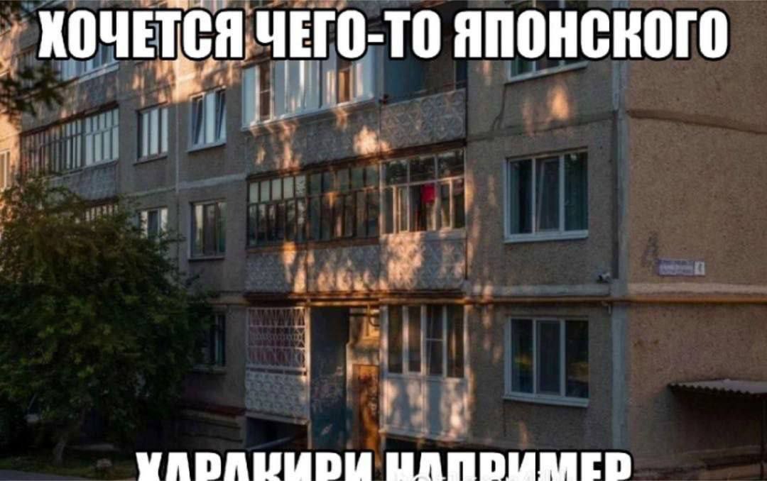 На изображении представлен фасад многоквартирного дома панельного типа в лучах заходящего солнца. Свет и тени от деревьев создают узоры на стенах и балконах. Сверху и снизу наложен текст, который гласит: "Хочется чего-то японского. Харакири например". Это ироничное высказывание, которое приписывает желание чего-то японского, как правило, ассоциирующееся с экзотикой или специфической кухней, к более мрачному японскому обычаю – харакири (ритуальному самоубийству).