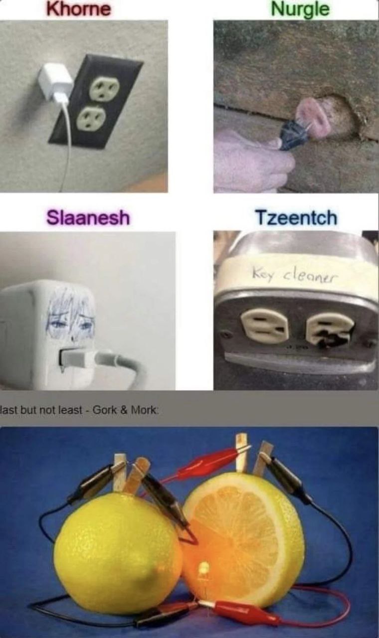На четырех квадратных изображениях показаны различные способы подключения вилок к розеткам, каждый из которых подписан именем одного из четырех богов Хаоса из вселенной Warhammer 40,000: Khorne, Nurgle, Slaanesh и Tzeentch. Под ними, на синем фоне, лежит лимон, к которому подключены провода и горит маленькая лампочка, а рядом лежит разрезанный лимон, к которому также подключены провода. Эта часть подписана как «И наконец — Горк и Морк» (last but not least — Gork & Mork).