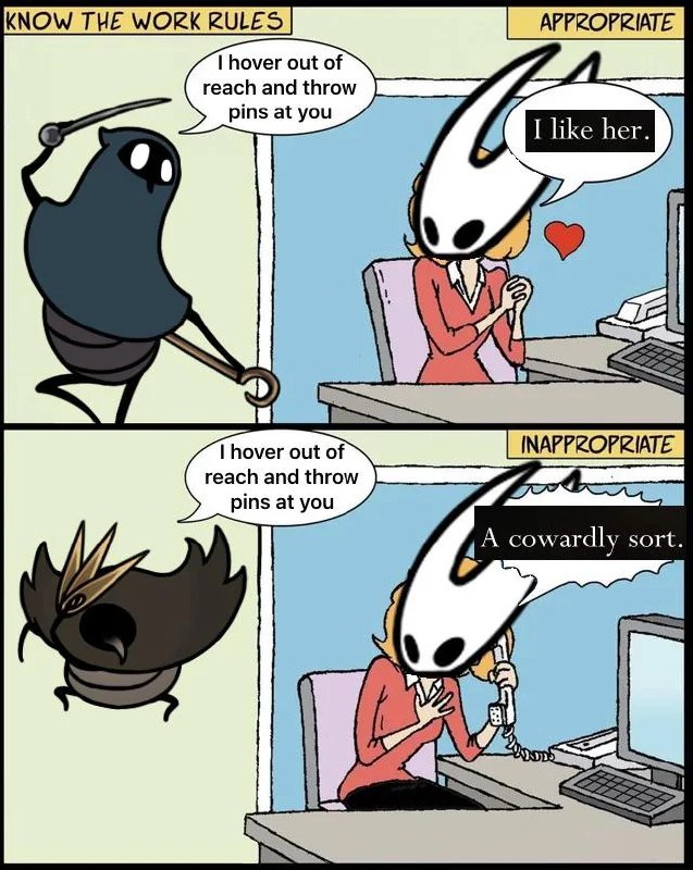 Мем "Правила работы" (Know the work rules) показывает, как офисная работница, с головой персонажа из Hollow Knight, по-разному реагирует на двух существ, которые говорят одну и ту же фразу: "I hover out of reach and throw pins at you" (Я парю вне досягаемости и бросаю в тебя булавки). В верхней части изображения, помеченной как "Appropriate" (Приемлемо), существо в плаще с крюком говорит эту фразу, и девушка отвечает: "I like her" (Она мне нравится), при этом над ней появляется сердечко. В нижней части, обозначенной как "Inappropriate" (Неприемлемо), другое, более агрессивно выглядящее существо с рогами произносит ту же фразу, и девушка, держа телефонную трубку, отвечает: "A cowardly sort" (Трус какой-то).