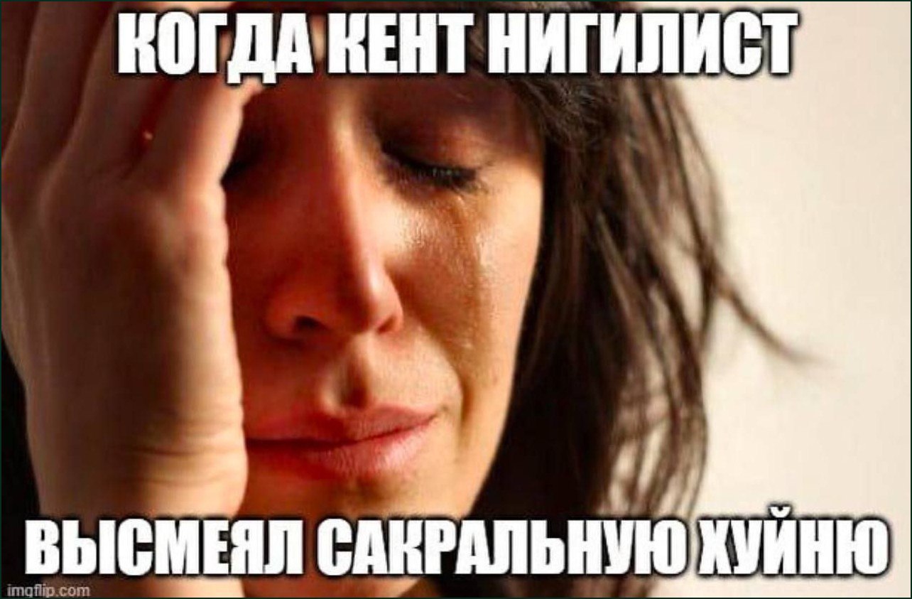 На изображении показана плачущая женщина, прижимающая руку ко лбу. Ее глаза закрыты, а по щекам текут слезы, выражая сильное расстройство или отчаяние. Текст мема гласит: "КОГДА КЕНТ НИГИЛИСТ ВЫСМЕЯЛ САКРАЛЬНУЮ ХУЙНЮ", что переводится как "КОГДА ДРУГ НИГИЛИСТ ВЫСМЕЯЛ САКРАЛЬНУЮ ХУЙНЮ". Это указывает на разочарование или боль от того, что близкий человек, придерживающийся нигилистических взглядов, обесценил что-то, что для говорящего имеет глубокий сакральный смысл или важность. Выражение лица женщины хорошо передает эмоциональное потрясение от такой ситуации.