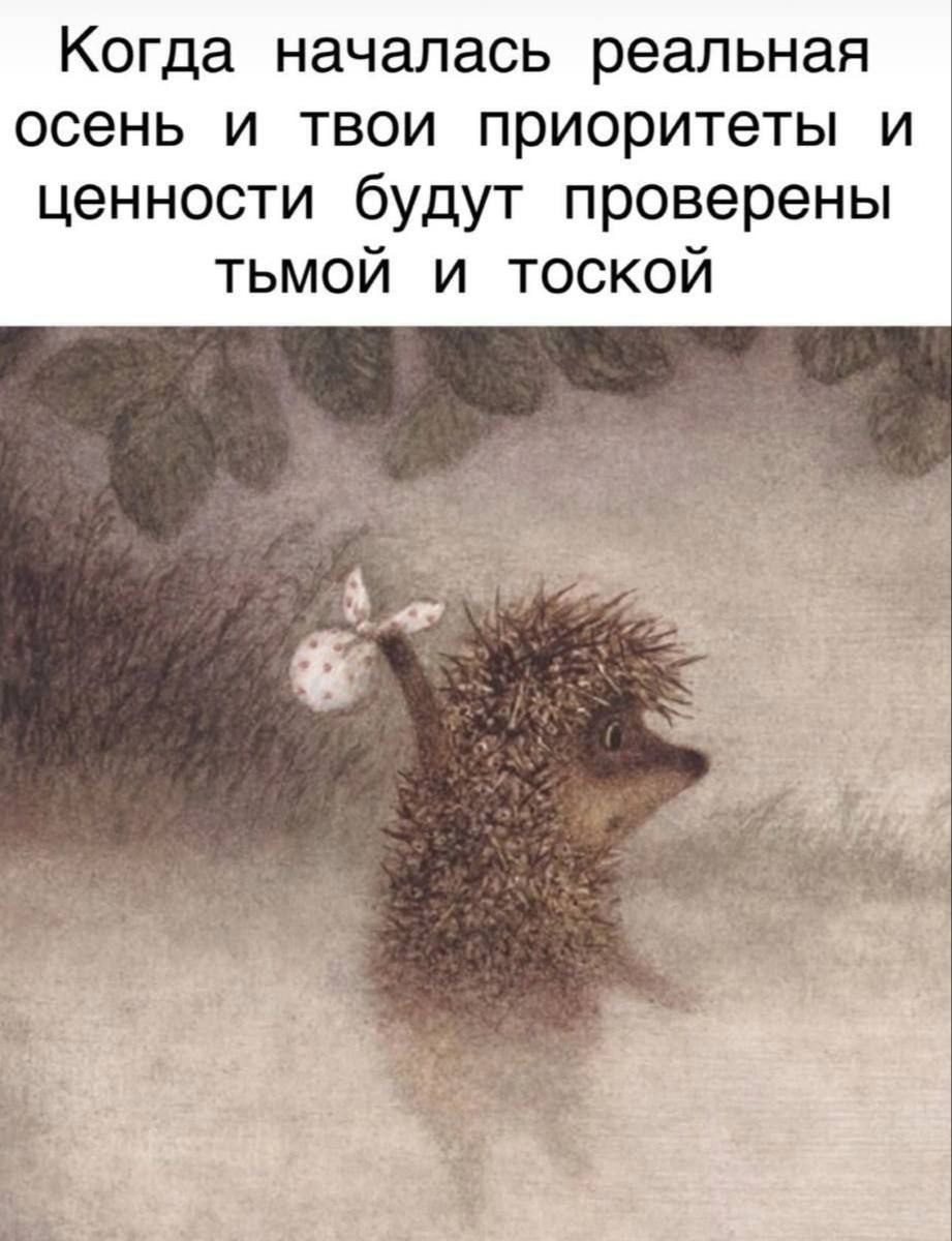 На картинке изображен маленький ёжик, который, кажется, куда-то уходит или путешествует. Он идет вправо, неся за спиной узелок, привязанный к палочке. Узелок белого цвета с красными точками, что придает ему милый и трогательный вид. Над ёжиком находится надпись на русском языке: «Когда началась реальная осень и твои приоритеты и ценности будут проверены тьмой и тоской», что переводится как «When real autumn began and your priorities and values will be tested by darkness and longing». Эта фраза создает атмосферу грусти, меланхолии и неопределенности, что хорошо сочетается с образом маленького ежика, отправляющегося в путь. Возможно, он ищет место для зимовки или просто уходит от наступающей осенней хандры. Мема хорошо передает ощущение одиночества и необходимости переосмыслить свои ценности перед лицом наступающих холодов и темноты, а также передает осеннюю депрессию, меланхолию и чувство безысходности.