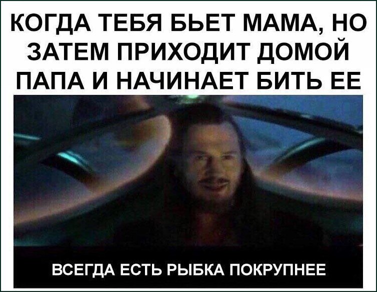 На меме изображен мужчина, предположительно Куай-Гон Джинн из "Звездных войн", с хитрой улыбкой на лице, как бы понимая что-то. Верхняя часть мема содержит текст, описывающий ситуацию, когда ребенка бьет мама, а затем домой приходит папа и начинает бить маму. Снизу, на черном фоне, есть дополнительный текст, который выражает мысль: "Всегда есть рыбка покрупнее". Эта фраза подчеркивает идею о том, что всегда найдется кто-то сильнее или авторитетнее.