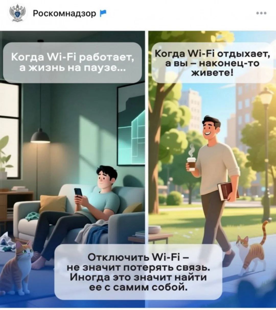 Мем от Роскомнадзора, разделённый на две части. Левая часть изображает мужчину, сидящего на диване с телефоном в руках, и кота рядом. Надпись гласит: "Когда Wi-Fi работает, а жизнь на паузе...". Правая часть показывает того же мужчину, гуляющего на улице с книгой и кофе, рядом с ним идёт кот. Надпись здесь: "Когда Wi-Fi отдыхает, а вы – наконец-то живёте!". Внизу на синем фоне общий текст, подводящий итог: "Отключить Wi-Fi – не значит потерять связь. Иногда это значит найти её с самим собой". Этот мем призывает отдохнуть от интернета и насладиться реальной жизнью, демонстрируя контраст между сидением дома и активным отдыхом на свежем воздухе. Идея мема в том, что отключение от цифрового мира может помочь восстановить связь с собой и окружающим миром, вместо того чтобы быть постоянно привязанным к гаджетам. Пользователи будут искать этот мем по запросам, связанным с Роскомнадзором, Wi-Fi и жизненными советами.