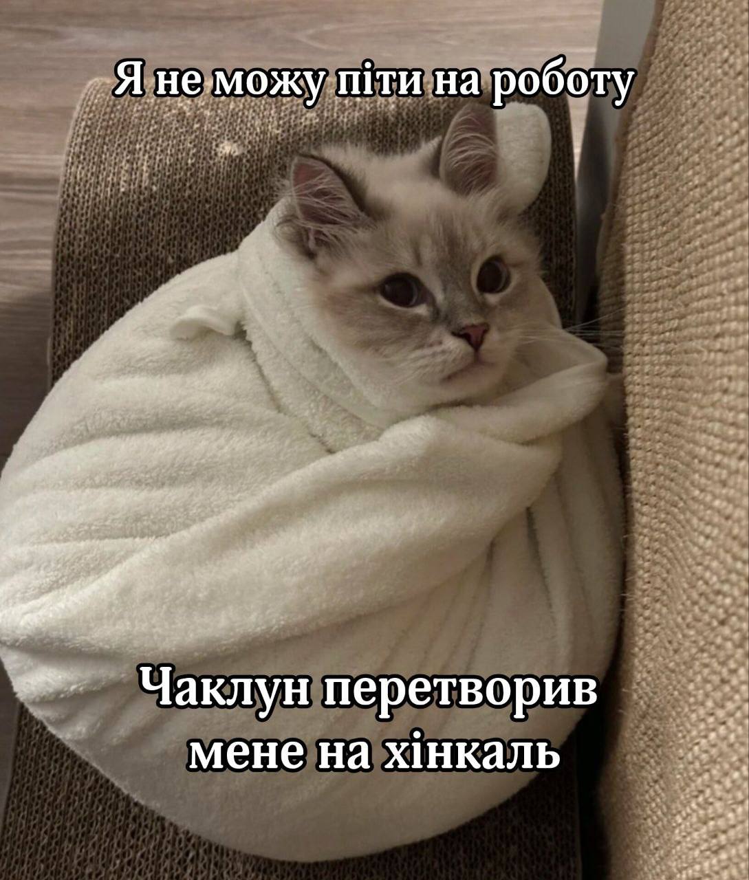 На изображении представлен милый пушистый котёнок белого цвета, который уютно завернут в белое полотенце или плед, напоминая формой хинкали. Он сидит, слегка прислонившись к чему-то, вероятно, к креслу или дивану, что создаёт впечатление его полной неподвижности. У котёнка большие, выразительные глаза и нежный окрас, придающий ему очень милый и беззащитный вид. Мем на украинском языке гласит: "Я не могу піти на роботу, Чаклун перетворив мене на хін каль" (Я не могу пойти на работу, колдун превратил меня в хинкали). Эта фраза в сочетании с видом котёнка создаёт комический эффект, как будто животное действительно превратилось в блюдо и поэтому не может выполнять свои обычные "рабочие" обязанности.