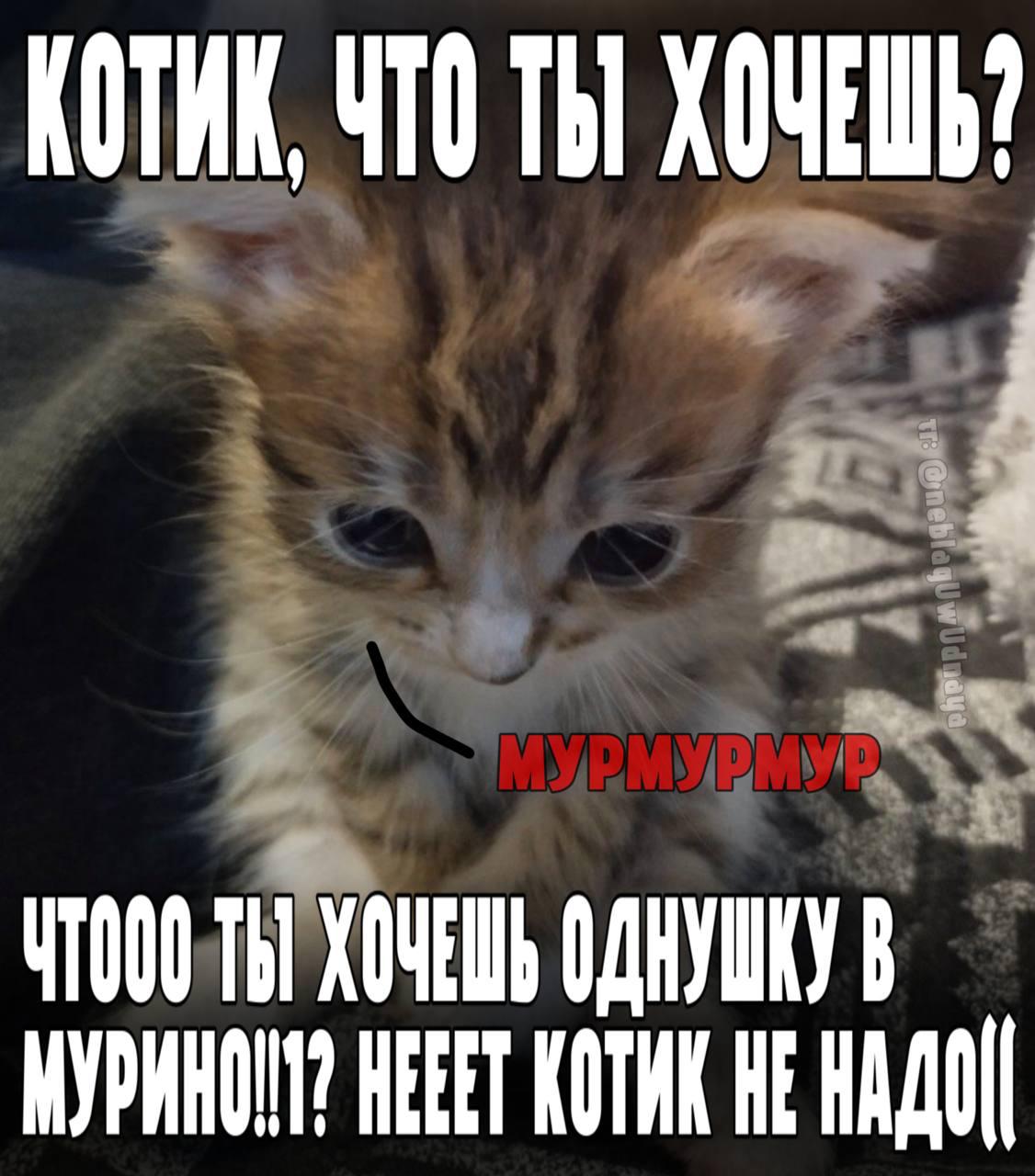 На изображении представлен милый рыже-белый полосатый котенок, сидящий и смотрящий немного вниз с жалобным видом. Над ним большими белыми буквами на черном фоне написано: «Котик, что ты хочешь?», а перед мордочкой котенка красными буквами: «Мурмурмур». В нижней части изображения также большими белыми буквами на черном фоне написано: «Чтооо ты хочешь однушку в Мурино!!1? Нееет котик не надо((». Мем обыгрывает стереотип о желании многих получить собственное жилье, даже если это небольшая квартира в пригороде Санкт-Петербурга — Мурино.