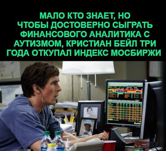 На изображении представлен кадр из фильма «Игра на понижение» с актером Кристианом Бэйлом в роли финансового аналитика Майкла Бьюрри. Он сидит за столом, внимательно глядя на мониторы, на которых отображаются графики и данные фондового рынка. На переднем плане видны бутылки с водой, стакан и другие предметы рабочего стола. Текст сверху гласит: «Мало кто знает, но чтобы достоверно сыграть финансового аналитика с аутизмом, Кристиан Бэйл три года откупал индекс Мосбиржи». Эта шутка намекает на сложность роли и на то, как актеры идут на крайние меры для полного погружения в персонажа, а также на финансовую деятельность в России.