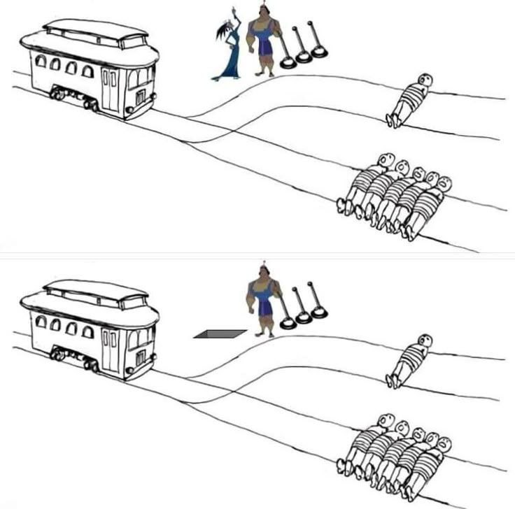 На картинке изображен шаблон мема с дилеммой вагонетки, на котором изображены персонажи Кронк и Изма из мультфильма «Похождения императора». Вагонетка приближается к развилке путей. На одном пути привязан один человек, на другом — пять человек. В первой панели Изма и Кронк стоят у рычага, причем Изма машет рукой в драматической позе, а Кронк, кажется, только что потянул рычаг, чтобы переключить вагонетку на путь с одним человеком. Во второй панели Изма исчезла, а Кронк стоит один рядом с рычагом и открытой ямой в земле, предполагая, что он избавился от Измы и теперь сам контролирует ситуацию.