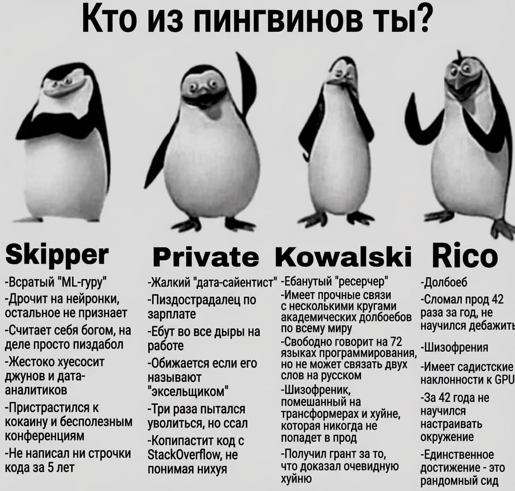 Кто из пингвинов ты? Skipper. Всратый "ML-гуру". Дрочит на нейронки, остальное не признает. Считает себя богом, на деле просто пиздабол. Жестоко хуесосит джунов и дата-аналитиков. Пристрастился к кокаину и бесполезным конференциям. Не написал ни строчки кода за 5 лет. Private. Жалкий "дата-саентист". Пиздострадалец по зарплате. Ебут во все дыры на работе. Обижается если его называют "эксельщиком". Три раза пытался уволиться, но ссал. Копипастит код с StackOverflow, не понимая нихуя. Kowalski. Ебанутый "ресерчер". Имеет прочные связи с несколькими кругами академических долбоебов по всему миру. Свободно говорит на 72 языках программирования, но не может связать двух слов на русском. Шизофреник, помешанный на трансформерах и хуйне, которая никогда не попадет в прод. Получил грант за то, что доказал очевидную хуйню. Rico. Долбоеб. Сломал прод 42 раза за год, не научился дебажить. Шизофрения. Имеет садистские наклонности к GPU. За 42 года не научился настраивать окружение. Единственное достижение - это рандомный сид.