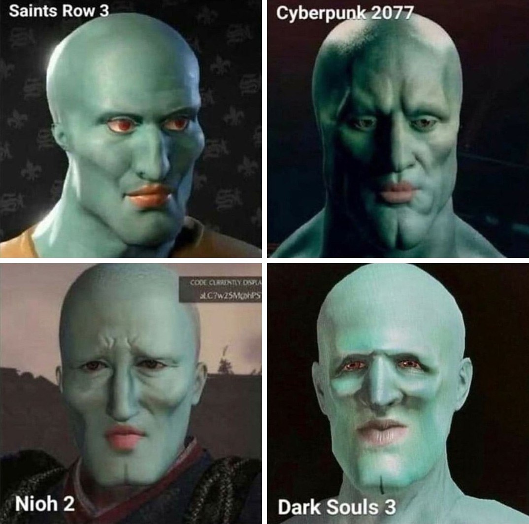 На картинке изображен мем с персонажем мультфильма "Спанч Боб Квадратные Штаны", Сквидвардом, который представлен в виде "Квадратного Сквидварда" – его идеализированной версии, когда он становится очень красивым и мускулистым. Этот образ Сквидварда вставлен в четыре разных видеоигры, показывая, как он мог бы выглядеть в каждой из них, учитывая стилистику и возможности игровых движков. Каждая из четырех частей изображения подписана названием игры: Saints Row 3, Cyberpunk 2077, Nioh 2 и Dark Souls 3. Видно, что в каждой игре Сквидвард имеет немного разные черты лица, оттенки кожи и текстуры, что отражает особенности графики и редакторов персонажей каждой игры. Тем не менее, его характерные черты - квадратное лицо, выраженный подбородок и бирюзовый оттенок кожи - остаются узнаваемыми.