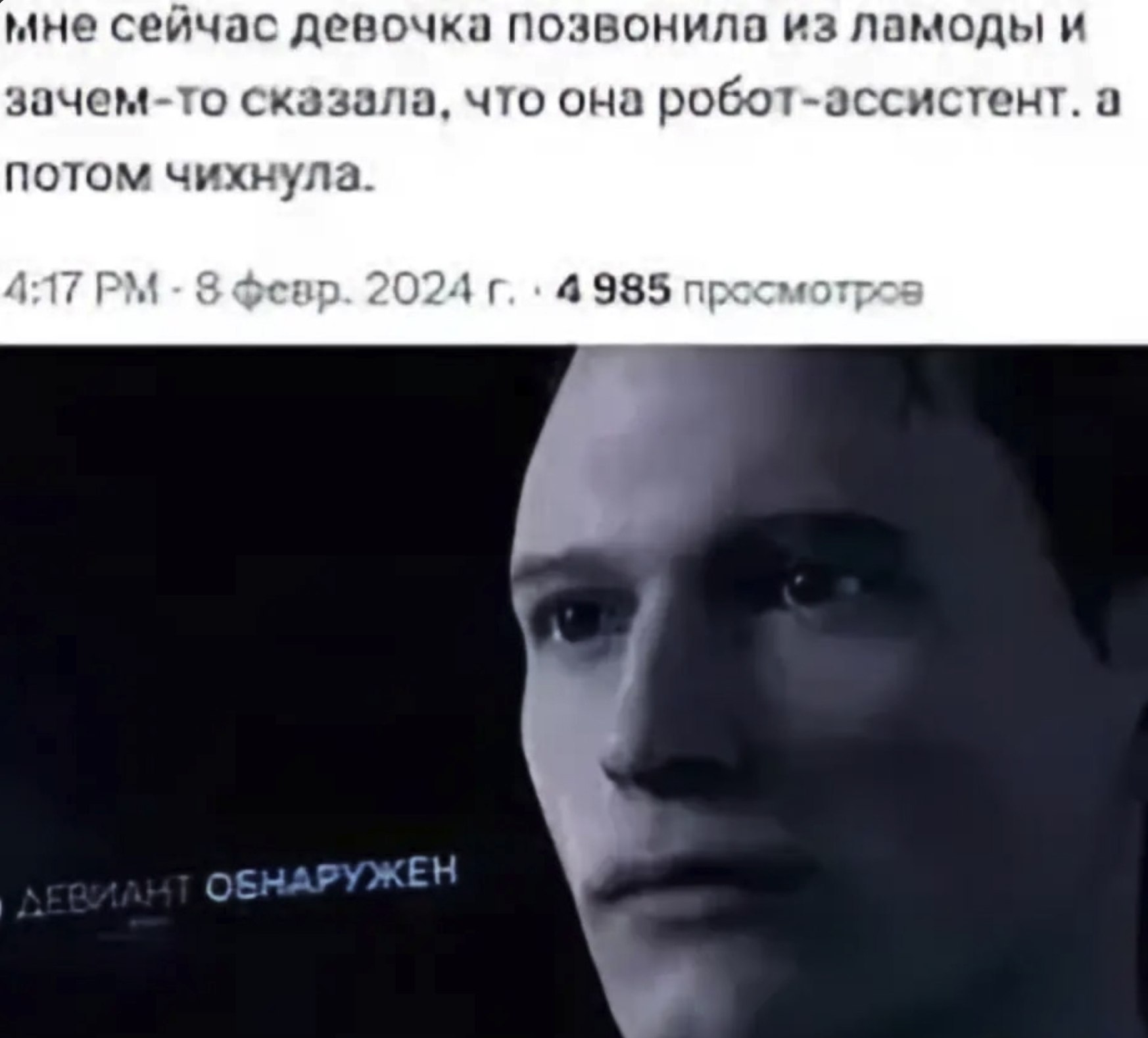 На картинке изображен кадр из игры Detroit: Become Human с персонажем Коннором, у которого на экране виден текст "ДЕВИАНТ ОБНАРУЖЕН". Над изображением расположен пост из социальной сети, в котором пользователь рассказывает, как ему позвонила девушка из Lamoda, представилась роботом-ассистентом, а потом чихнула. Это событие вызвало удивление у Коннора, намекая на "обнаруженного девианта", то есть робота, который проявляет человеческие эмоции или действия. Мем обыгрывает идею о том, что роботы или ИИ могут проявлять человеческие черты, что противоречит их запрограммированной природе, и в данном случае "девушка из Ламоды робот-ассистент чихнула", что стало поводом для подозрения.