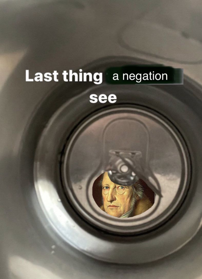 На изображении показан вид сверху на открытую алюминиевую банку, внутри которой, вместо напитка, расположено лицо немецкого философа Георга Вильгельма Фридриха Гегеля. Верхний край банки и отверстие для питья хорошо видны. Над изображением банки расположен текст "Last thing a negation see", который переводится как "Последнее, что видит отрицание". Этот мем обыгрывает философскую концепцию Гегеля о диалектике, где отрицание является ключевым моментом в развитии идеи.