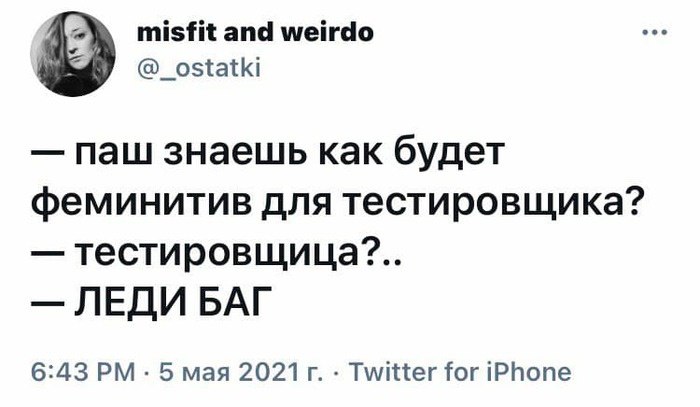 Misfit and weirdo. @_ostatki. — Паш знаешь как будет феминитив для тестировщика? — Тестировщица?.. — Леди Баг. 6:43 PM · 5 мая 2021 г. · Twitter for iPhone.