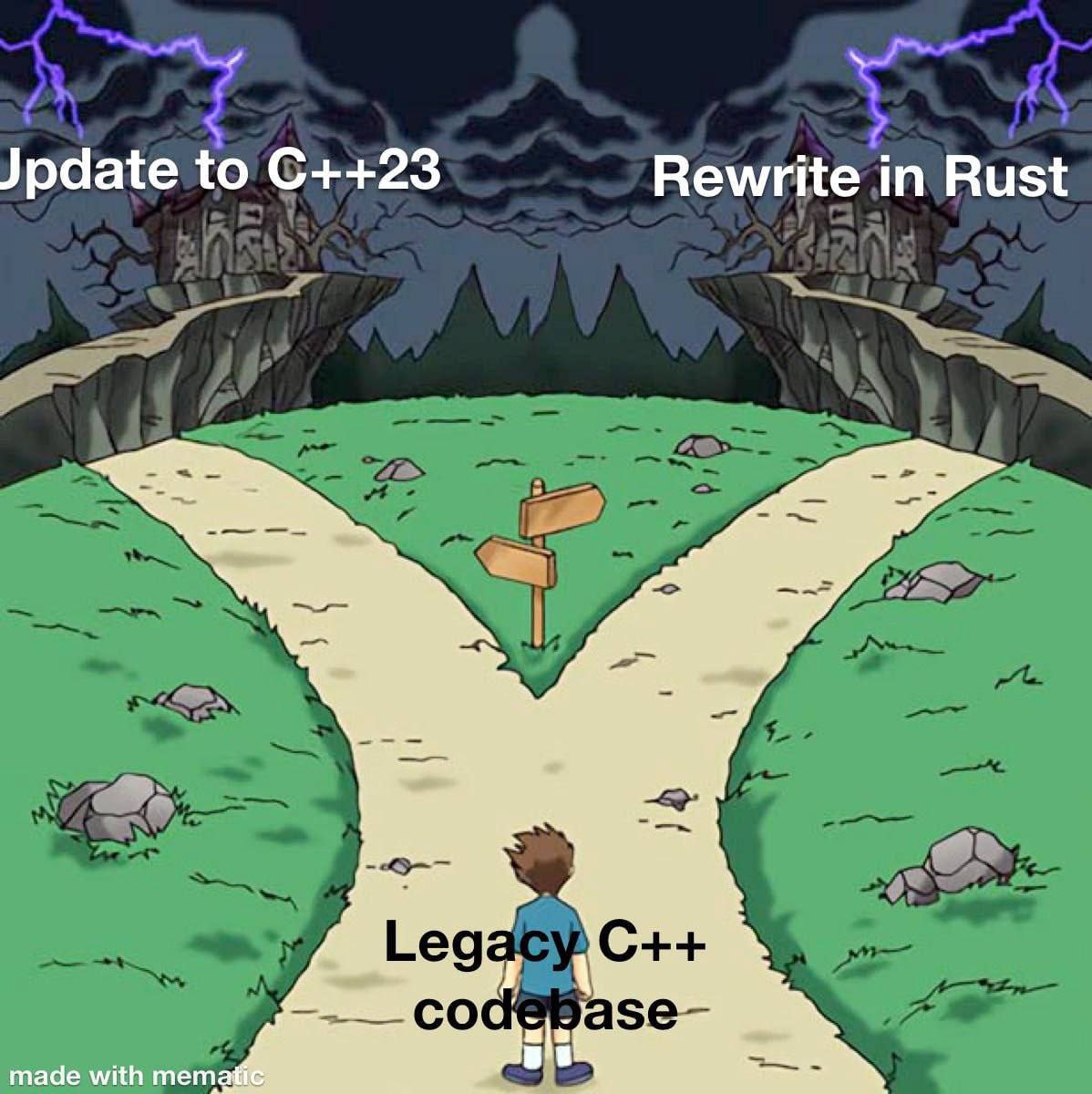 На изображении показан мем с мальчиком, стоящим на распутье. Он символизирует программиста, который столкнулся с унаследованной кодовой базой (Legacy C++ codebase) и должен выбрать одно из двух сложных решений: «Update to C++23» (обновление до C++23) или «Rewrite in Rust» (переписывание на Rust). Обе дороги ведут к замкам, над которыми сверкают молнии, что подчёркивает сложность и потенциальные проблемы каждого из вариантов. Этот мем отражает дилемму, с которой часто сталкиваются разработчики при работе со старым кодом на C++, выбирая между его модернизацией или полной заменой на более современный и безопасный язык, такой как Rust.