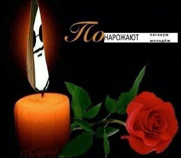 На изображении представлен фон, выполненный в черном цвете, который создает атмосферу траура или грусти. В левой части кадра горит оранжевая свеча, ее пламя вытянуто вверх, создавая яркий контраст с темным фоном. Рядом со свечой, в правой нижней части, лежит красная роза с зелеными листьями, символизирующая красоту и, возможно, память. В верхней части изображения, над свечой и розой, размещен текст, который гласит: «По нарожают поганую молодежь». Эти слова, вероятно, выражают негодование или разочарование по поводу молодого поколения, что в сочетании с общим мрачным оформлением может указывать на саркастический или меланхоличный характер послания, часто ассоциируемый с высказываниями Егора Летова.